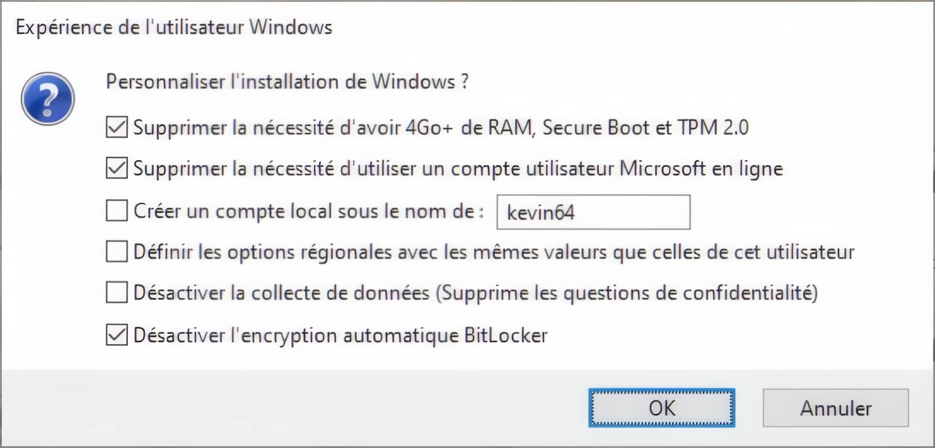 De ne pas cocher Supprimer la nécessité d’avoir 4 Go+ de RAM, Secur Boot et TPM 2.0.