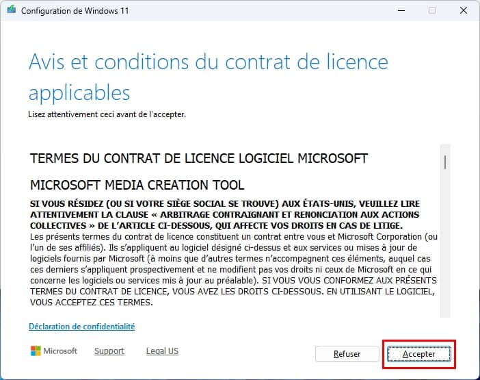 Afin de procéder à l’installation de Windows 11, Microsoft propose l’outil MediaCreatorTool que vous devez télécharger dans le répertoire désiré. Ensuite :