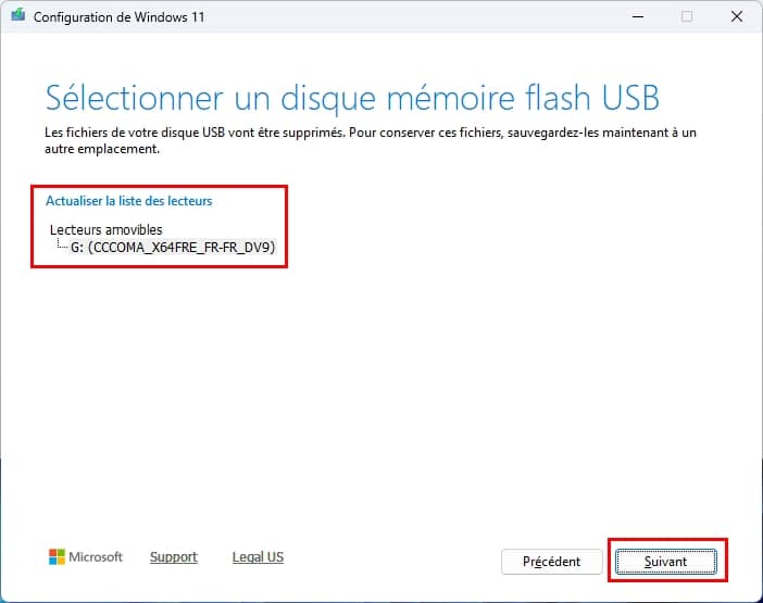 Penser à la sauvegarder avant d’exécuter MediaCrationtool, car tout son contenu sera effacé.