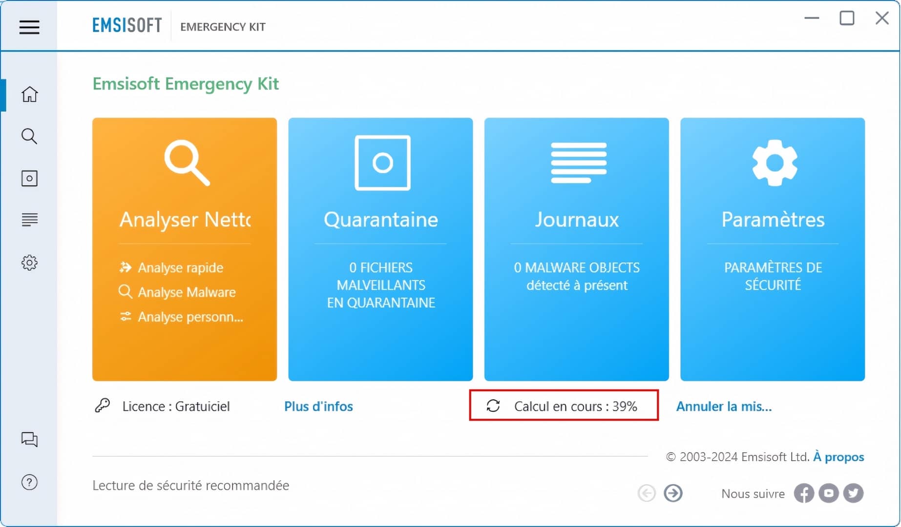 - Les mises à jour de la base virale et de l’application, si nécessaire, se lance dès son ouverture. Il se peut qu’il vous soit demandé de relancer Emsisoft Emergency Kit pour le bon fonctionnement de celui-ci.