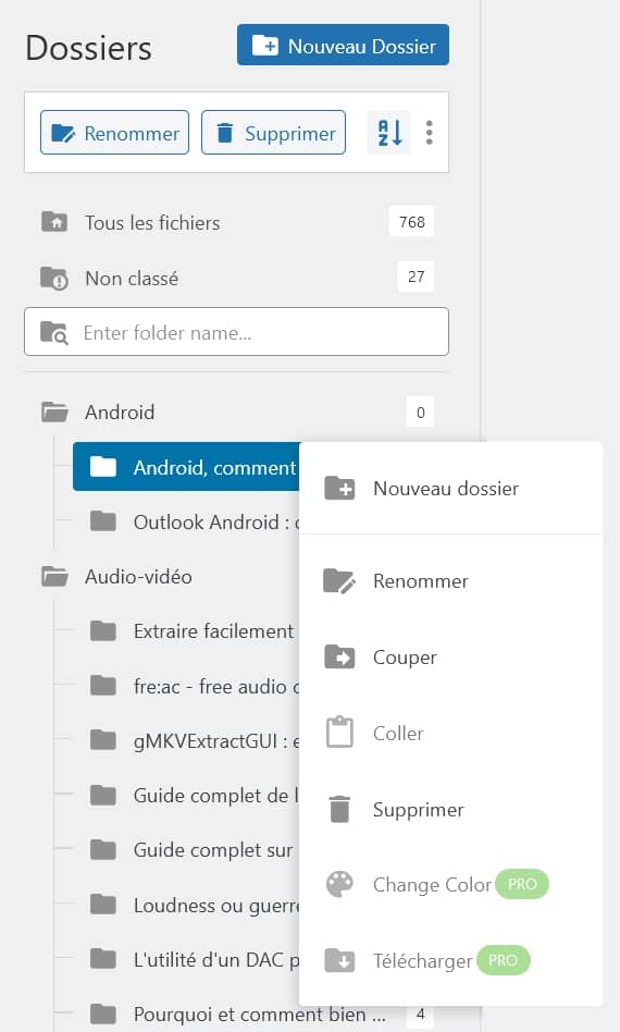 - De renommer ou de supprimer un dossier ou sous-dossier. Sélectionner un des dossiers pour effectuer cette tâche. Disponible également par clic droit. Le tri automatique alphabétique n’est disponible qu’à ceux qui ont souscrit à la version pro.