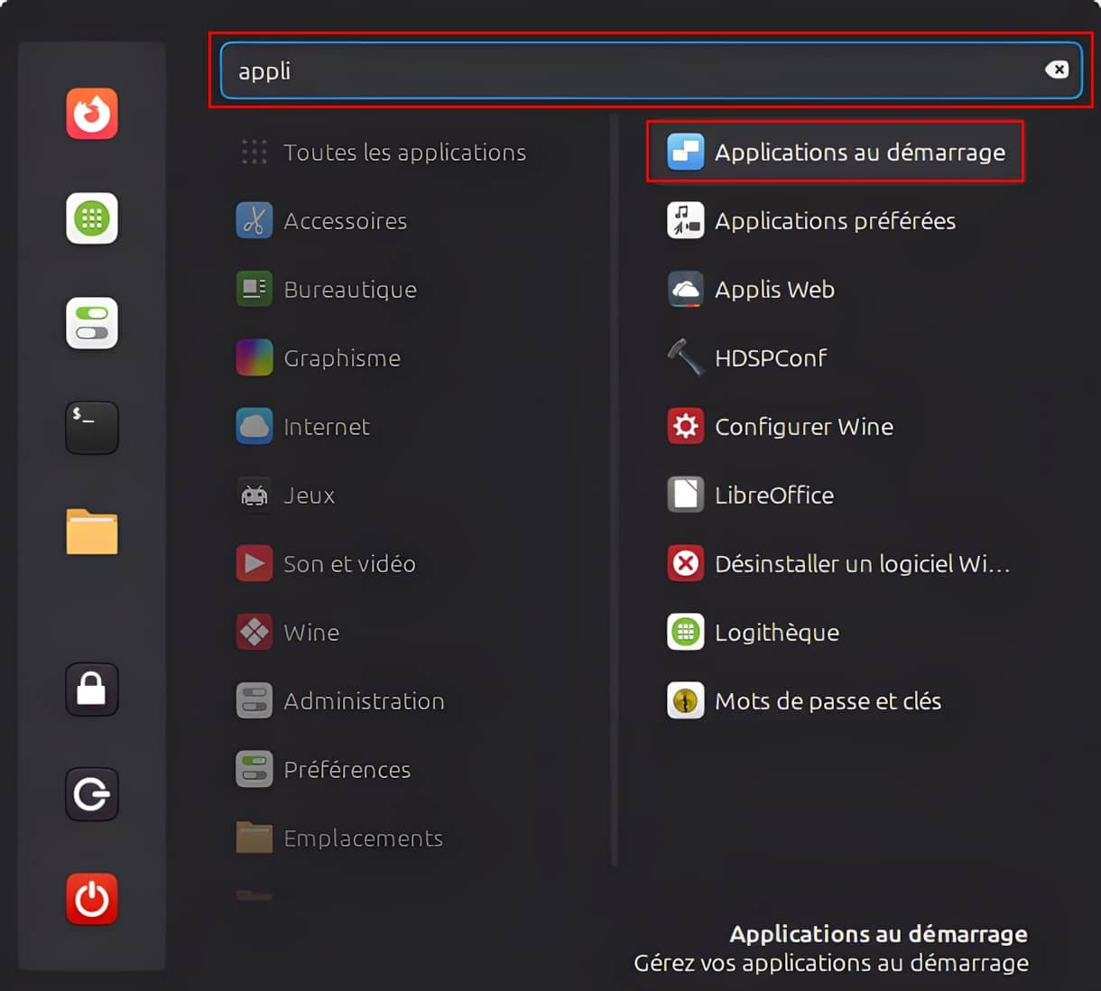 - Ouvrir le menu démarrer de Linux Mint > saisir appli, zone de recherche > ouvrir, Applications au démarrage