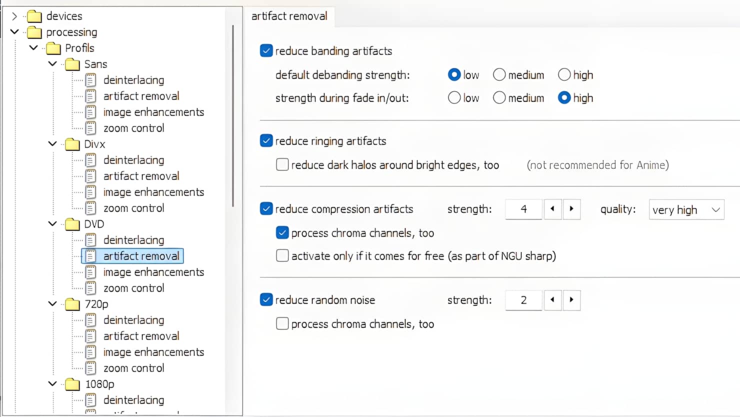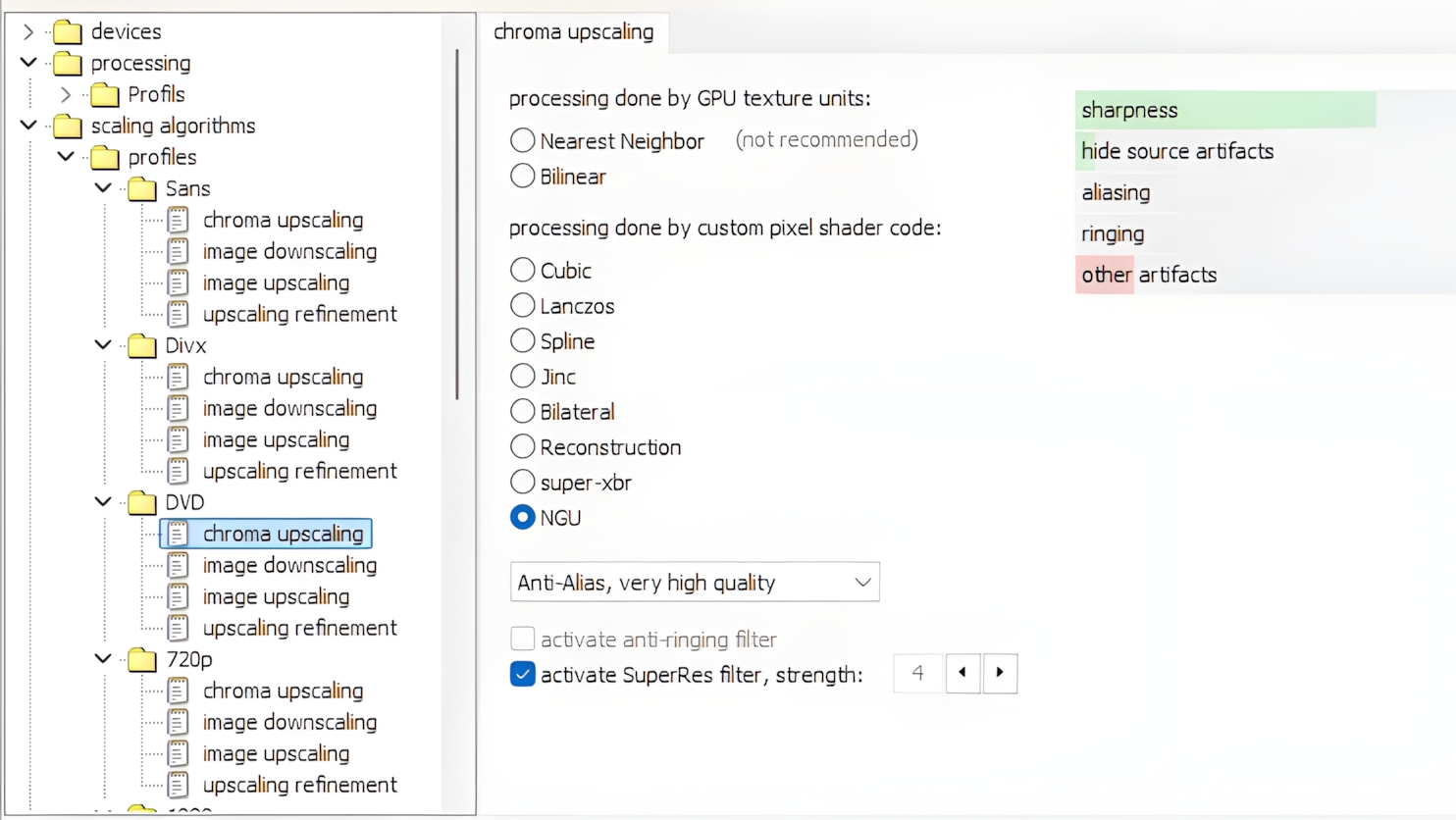 - Chroma upscaling : Je vous recommande le NGU, qui est de loin le plus performant, mais aussi le plus consommateur, avec le profil Anti-alias, very high quality.