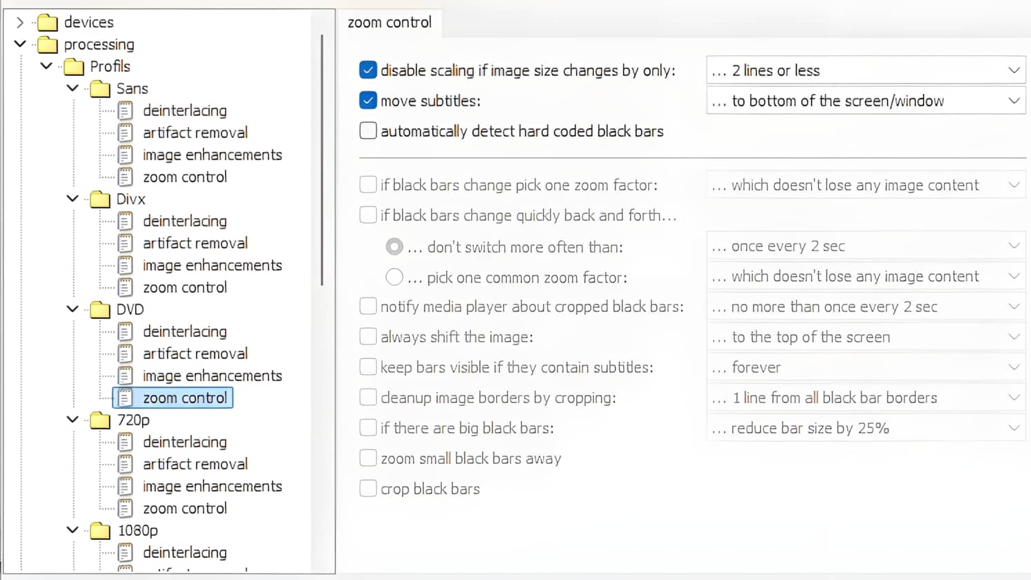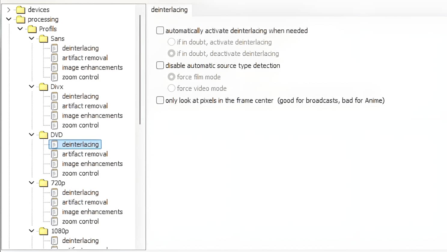 - Deinterlacing : je le désactive puisque je lui préfère la fonctionnalité intégrée à Potplayer.