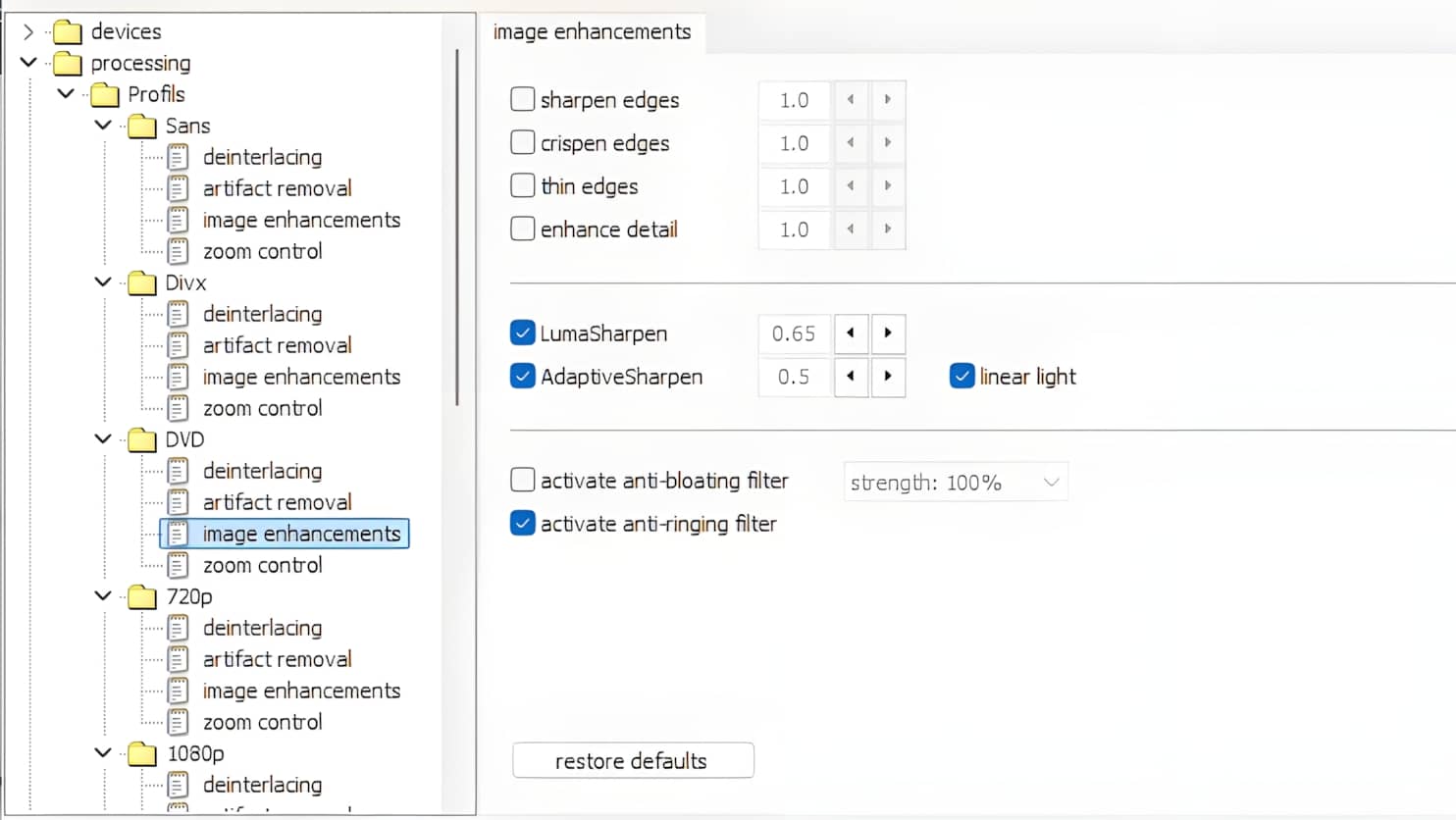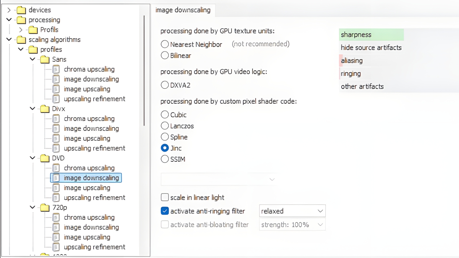 Image downscaling : n’est utile que pour les définitions supérieures à vos afficheurs, 1440p, UHD 4K-8K. Jinc est celui qui est le plus cité sur internet. Il est important d’activer l’Anti-ringing, profil Relaxed.
