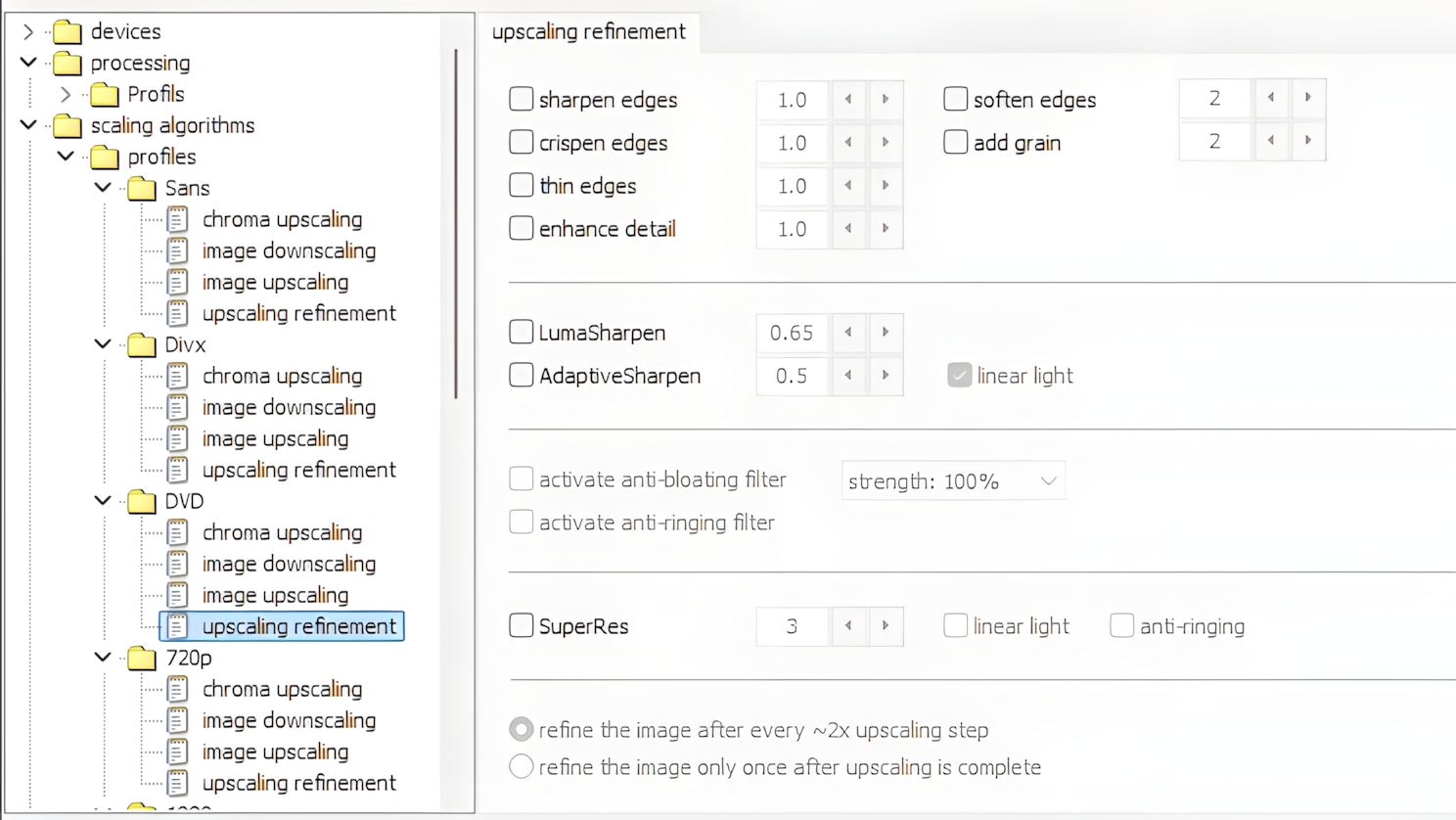 - Image upscaling : identique au Chroma upscaling > NGU Anti-alias > Very high. Pour le reste, laisser MadVR décider.