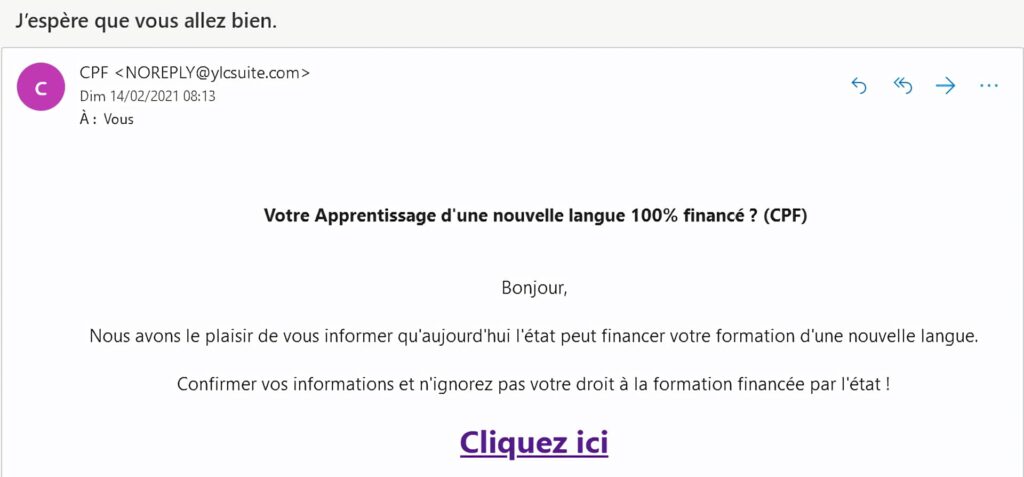 Voici un mail d’hameçonnage reçu, qui fait croire que vous pouvez vous faire financer l’apprentissage à 100% par votre compte CPF. Jusque-là bonne nouvelle, si vous aviez effectivement dans l’idée de vous perfectionner dans une langue en particulier, sauf que non. Pourquoi ?