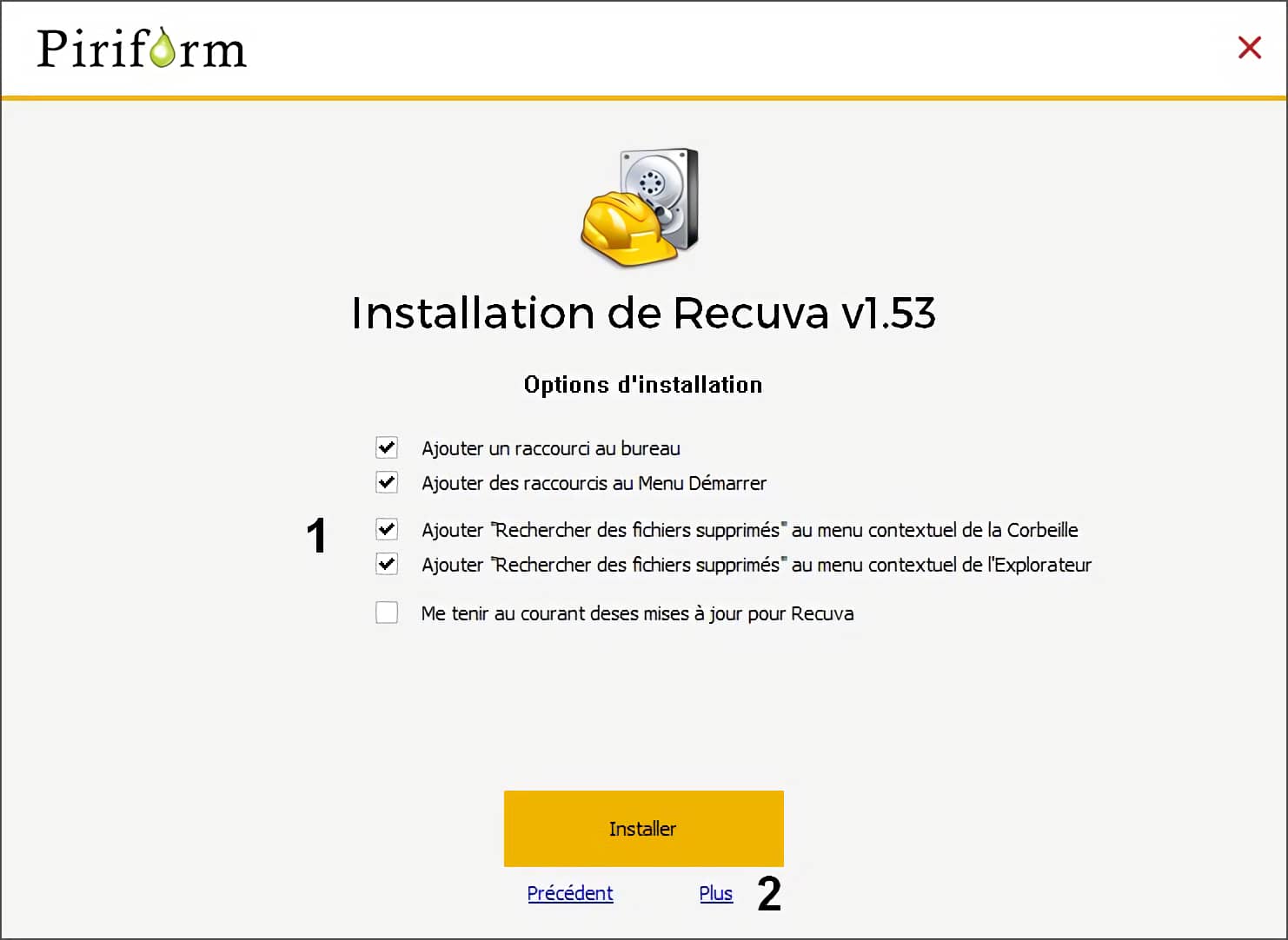 Une fois Recuva téléchargé dans le dossier voulu, son installation ne pose guère de difficultés, aucun programme publicitaire n’est proposé.