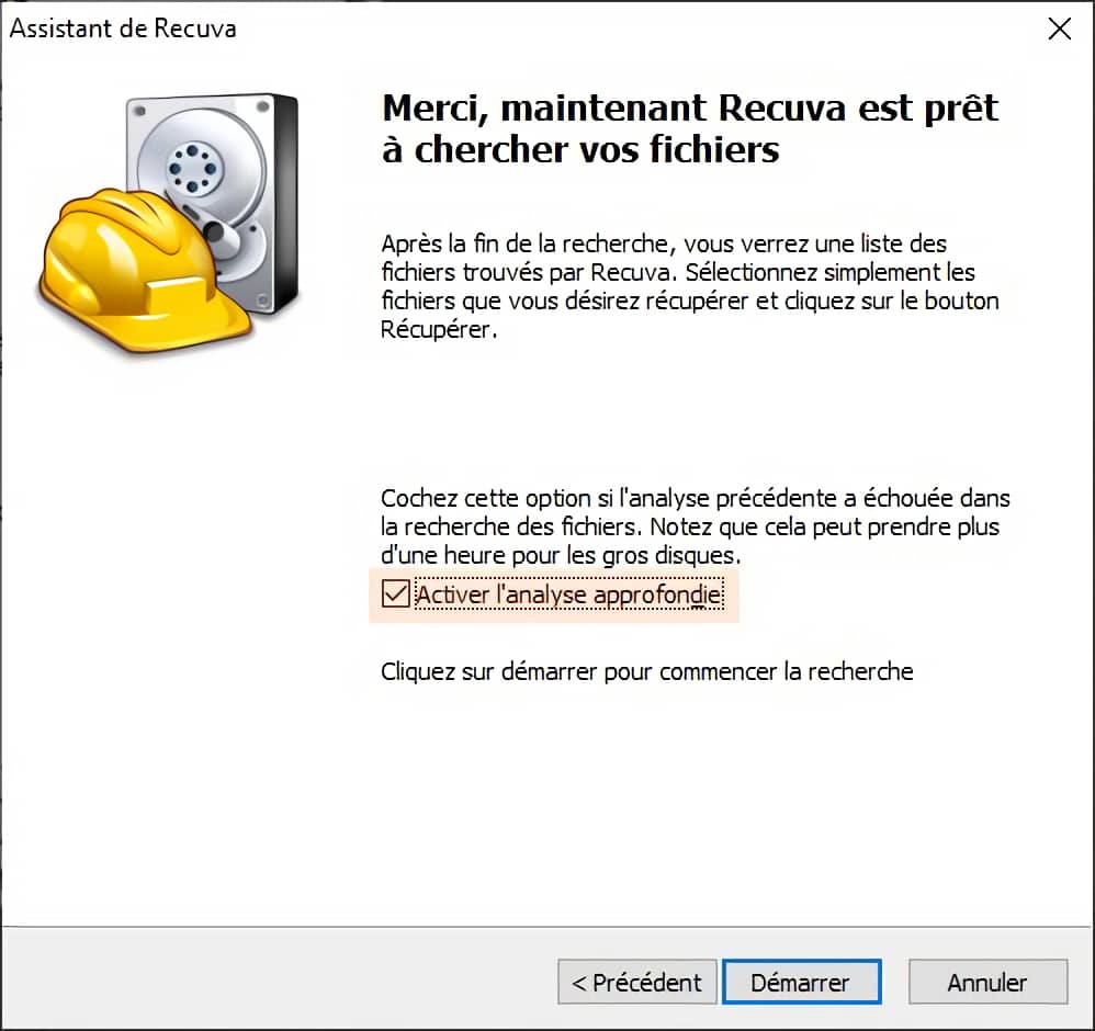 Toujours cocher « Activer l’analyse approfondie ». Recuva va donc effectuer un scan en profondeur, beaucoup plus long, mais qui garantit grandement vos chances de retrouver vos données.