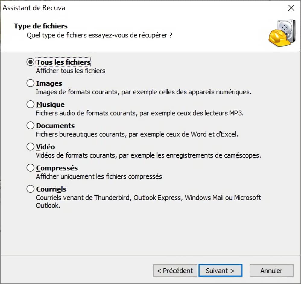 - Tous les types : utiles si avez effacé divers types de fichiers,