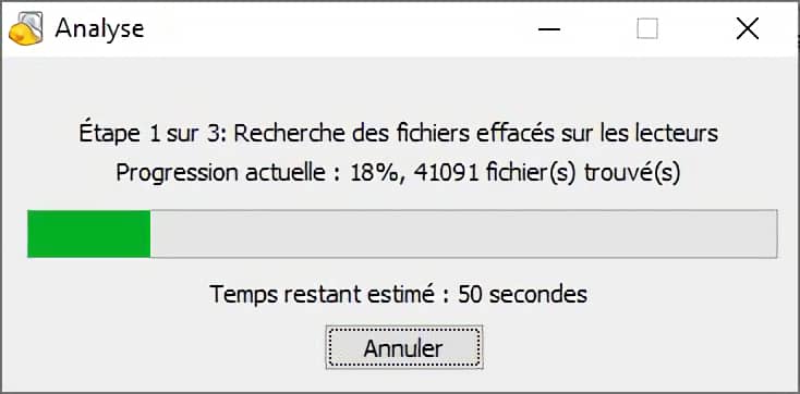 Ce qui lance la boîte de dialogue détaillée de la progression du scan (pourcentage, fichiers trouvés et estimation du temps restant).
