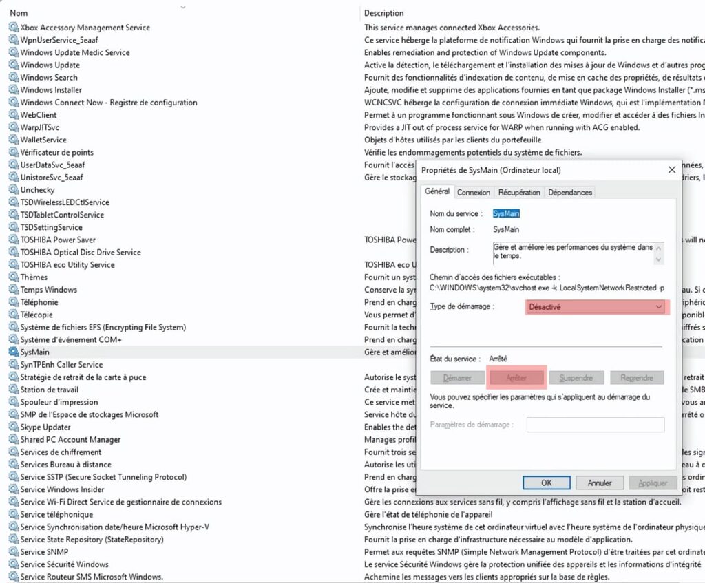 Dans un premier temps, il faut, « Arrêter » le service, puis de le « désactiver« , « Type de démarrage » liste déroulante, sélectionner « désactiver » et enfin sur Ok pour valider. Normalement, au prochain redémarrage, SysMain ne doit plus s’exécuter.