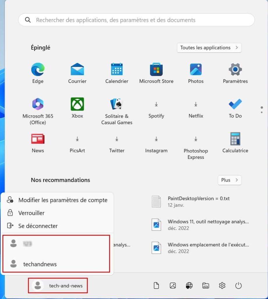 Ouvrir le menu Démarrer, puis cliquer sur l’utilisateur en bas. Deux méthodes s’offrent à vous :