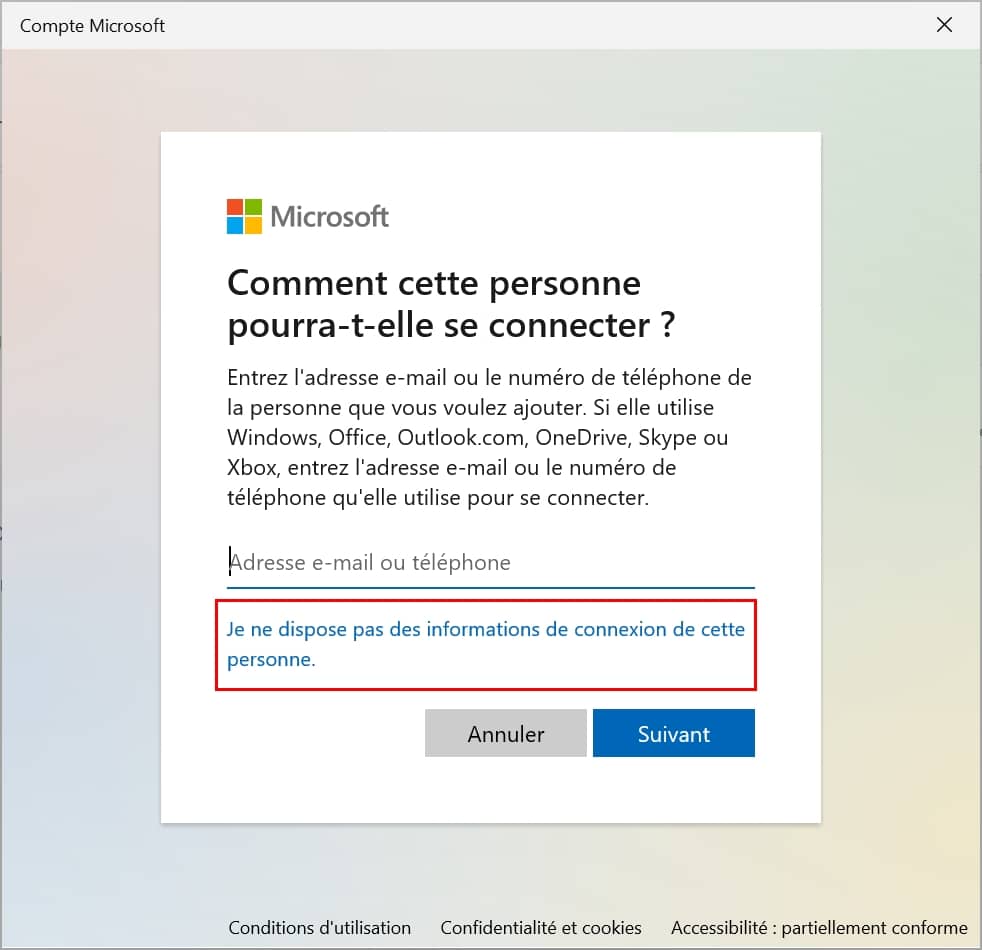 - Il vous suffit de cliquer sur « Ajouter un utilisateur sans compte Microsoft ».