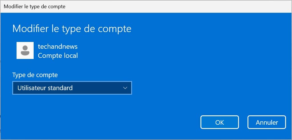 - Changer le type de compte : par défaut, Windows applique le profil standard qui est limité pour des raisons de sécurité, contrairement à un compte administrateur.