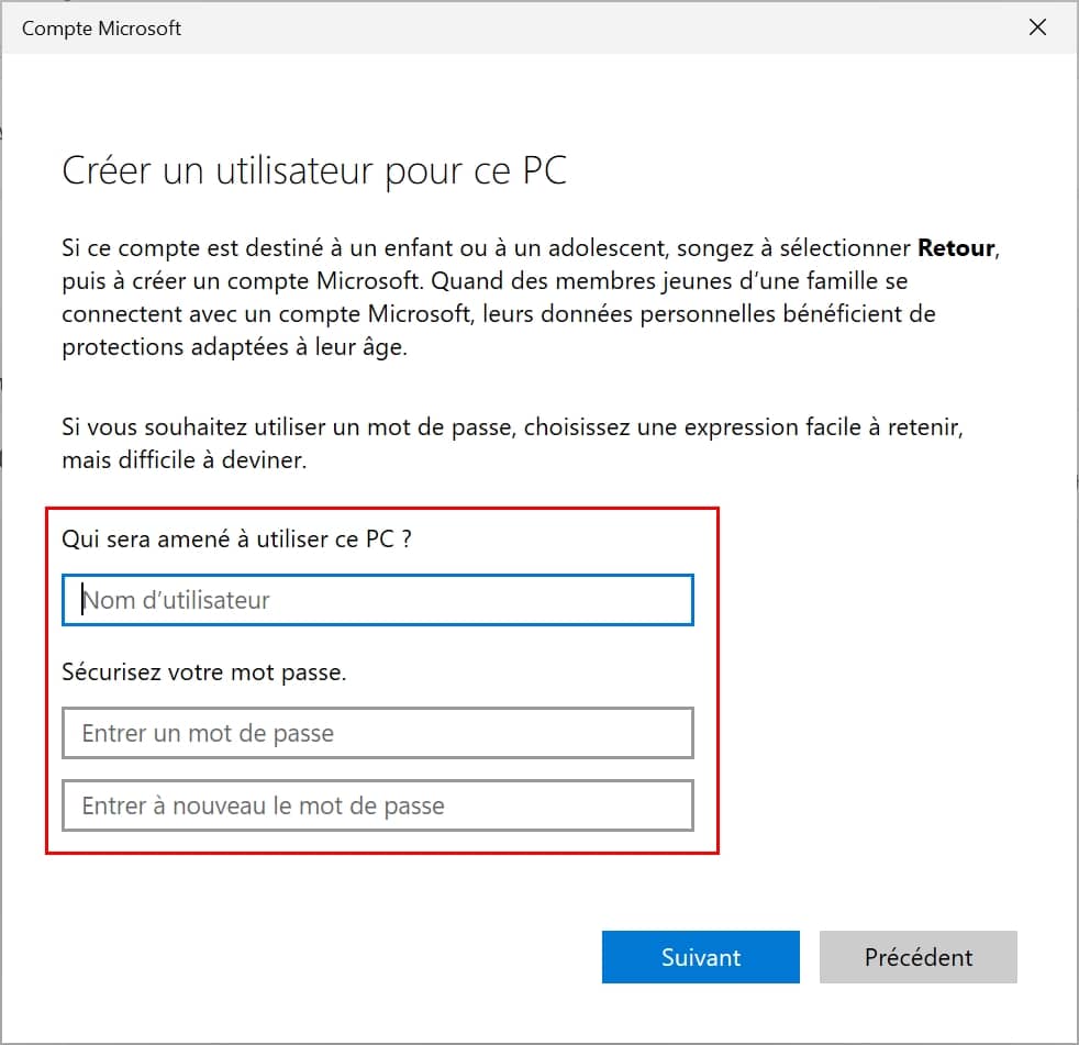 Il ne vous reste plus qu’à cliquer sur le bouton suivant pour créer le nouvel utilisateur local pour qu’il s’ajoute automatiquement à la liste des utilisateurs se trouvant sous Autres utilisateurs.