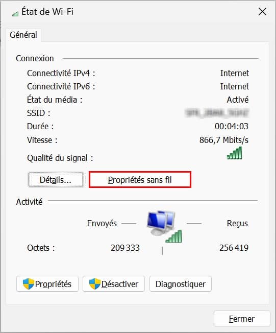 - Cliquer sur Propriétés sans fil,