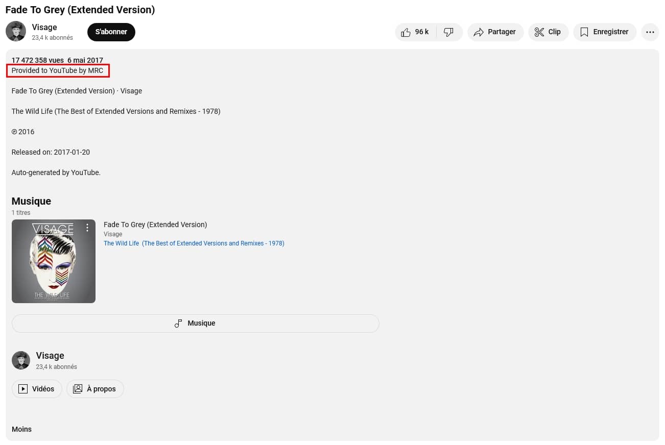 Comment les reconnaître ? Le plus simple est de se rendre directement sur la page du groupe ou de l’artiste. Mais quand on tombe sur une recommandation de YouTube, il est très facile de le vérifier grâce à la mention « Provided to YouTube » suivit de la maison d’édition et se trouvant dans la barre d’info sous la vidéo.