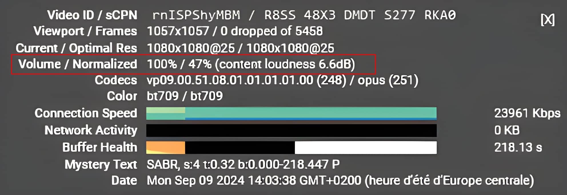 L’accès s’effectue : clic droit sur une vidéo > Stats pour les nerds.